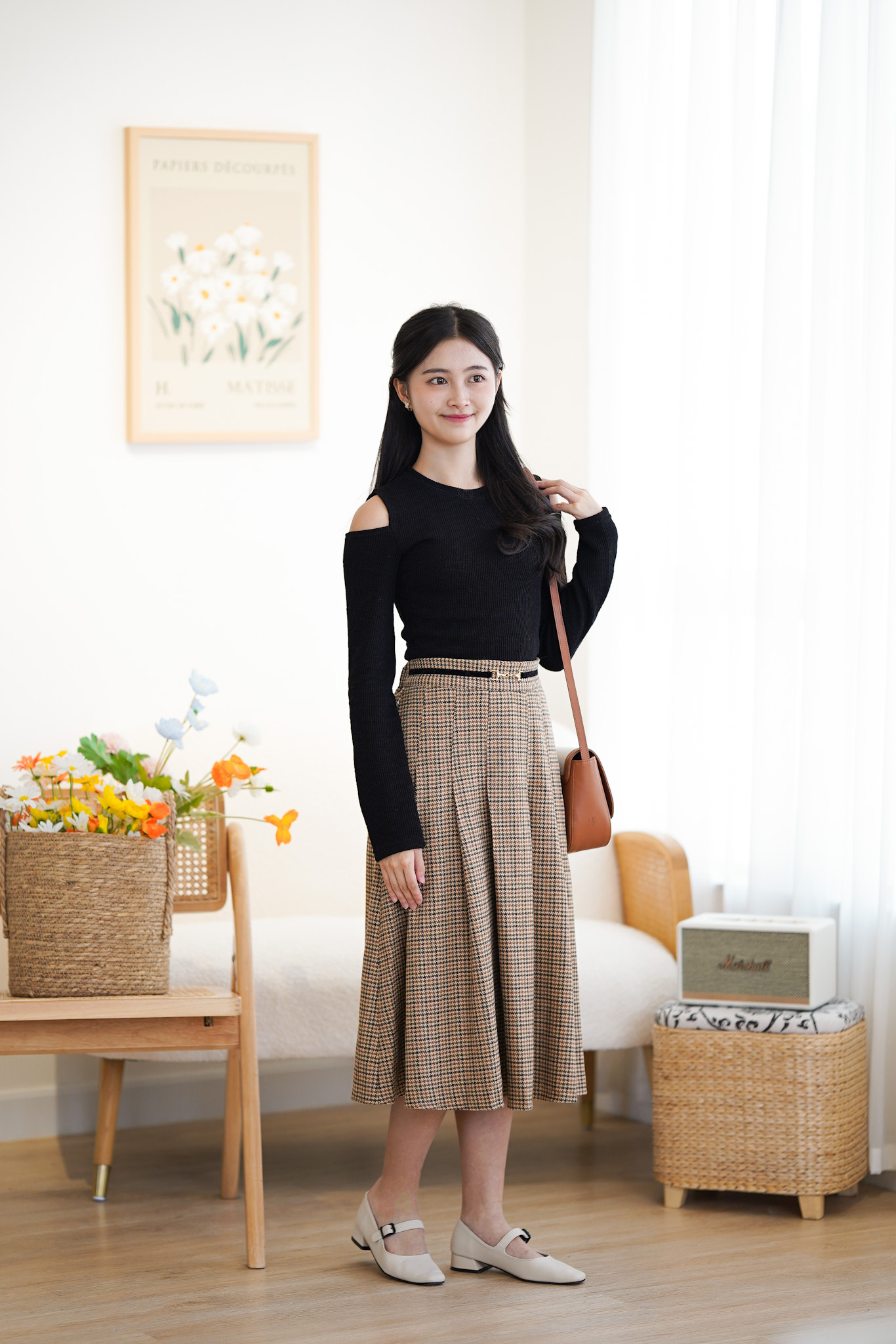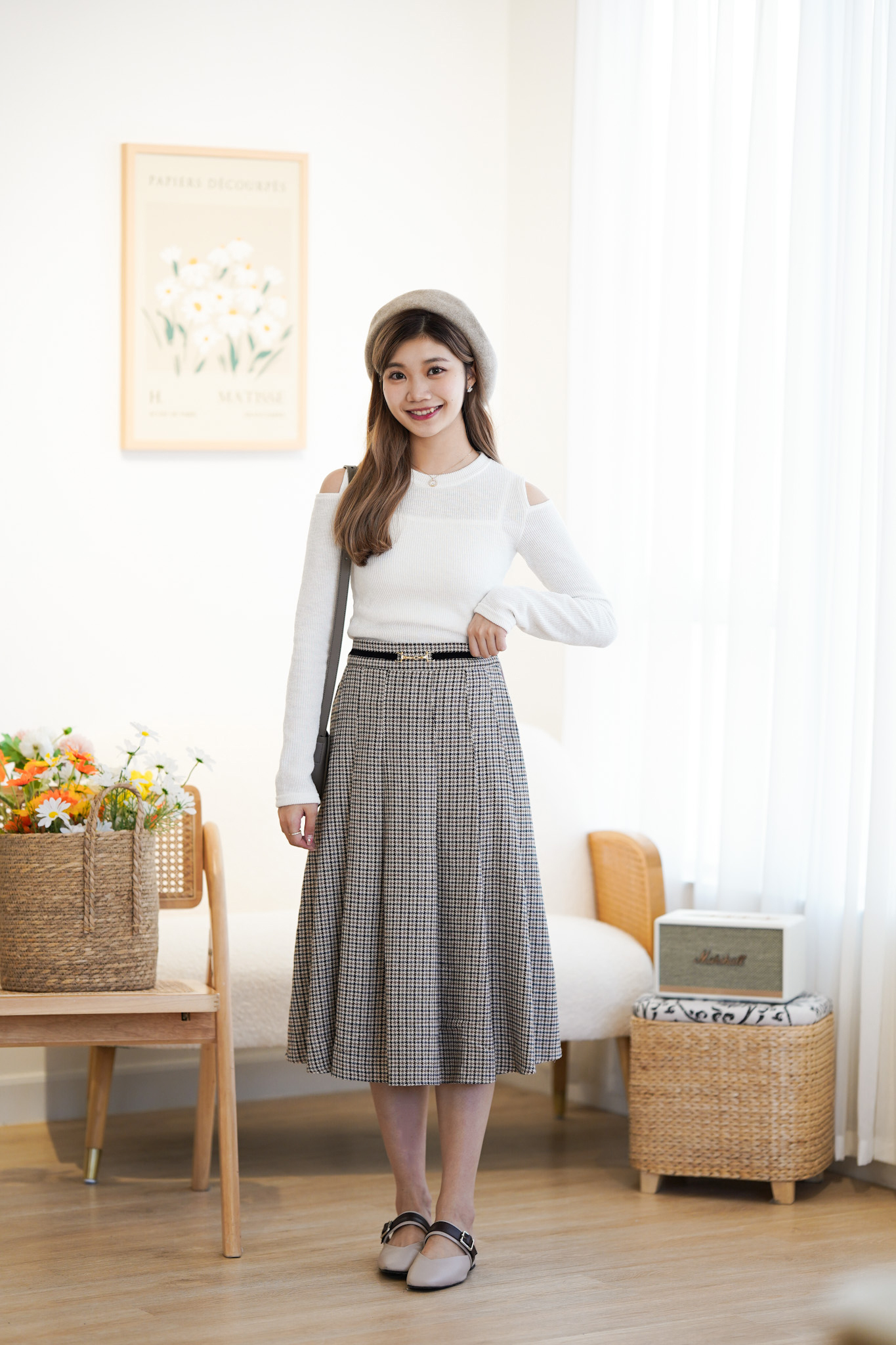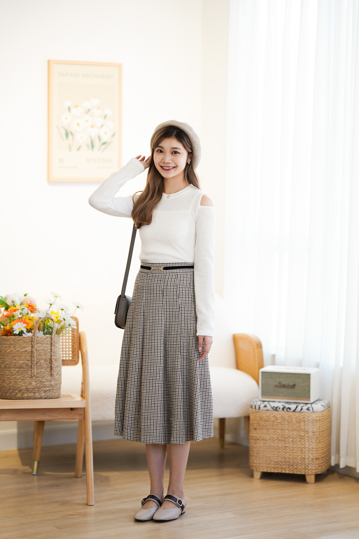SK372 Houndstooth Belted Long Skirt