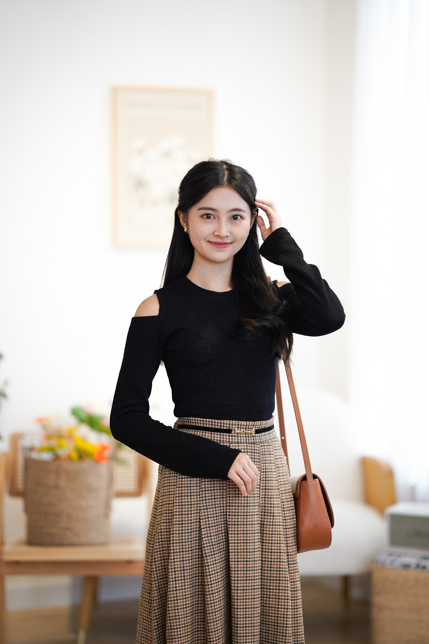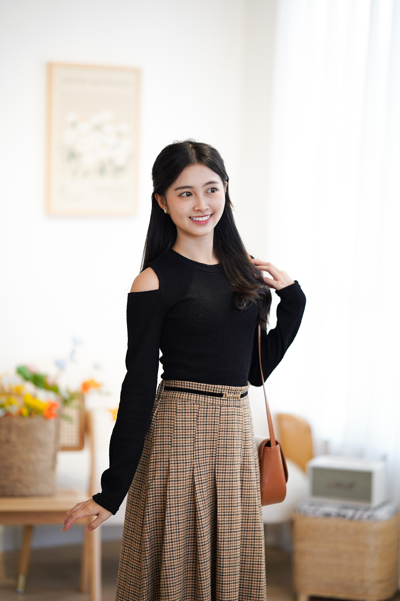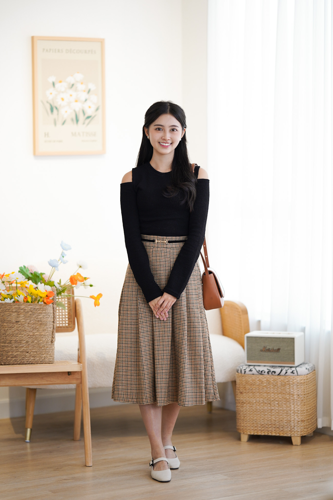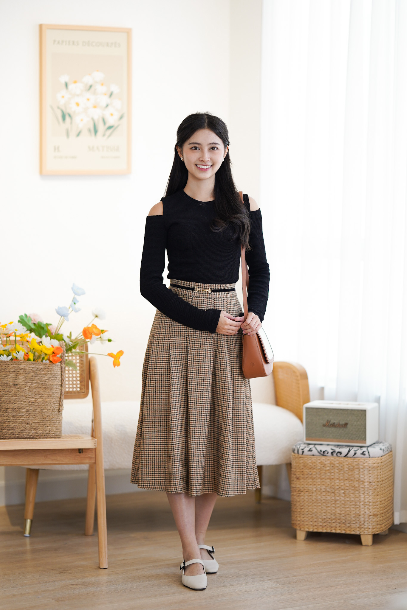 SK372 Houndstooth Belted Long Skirt