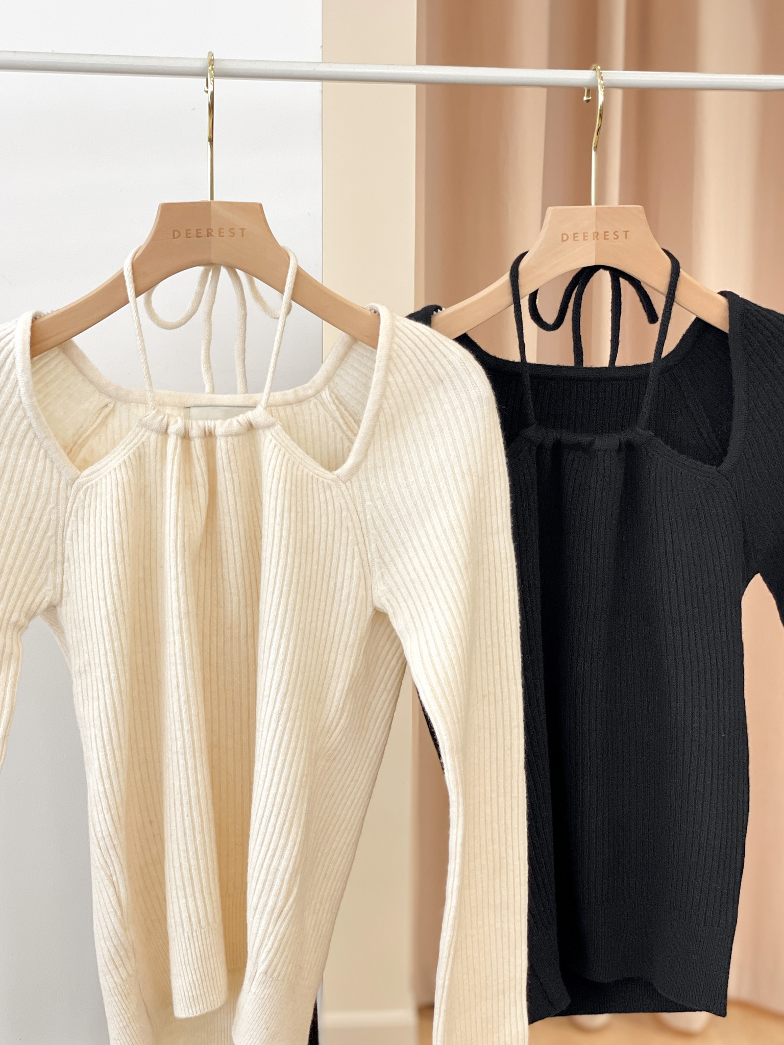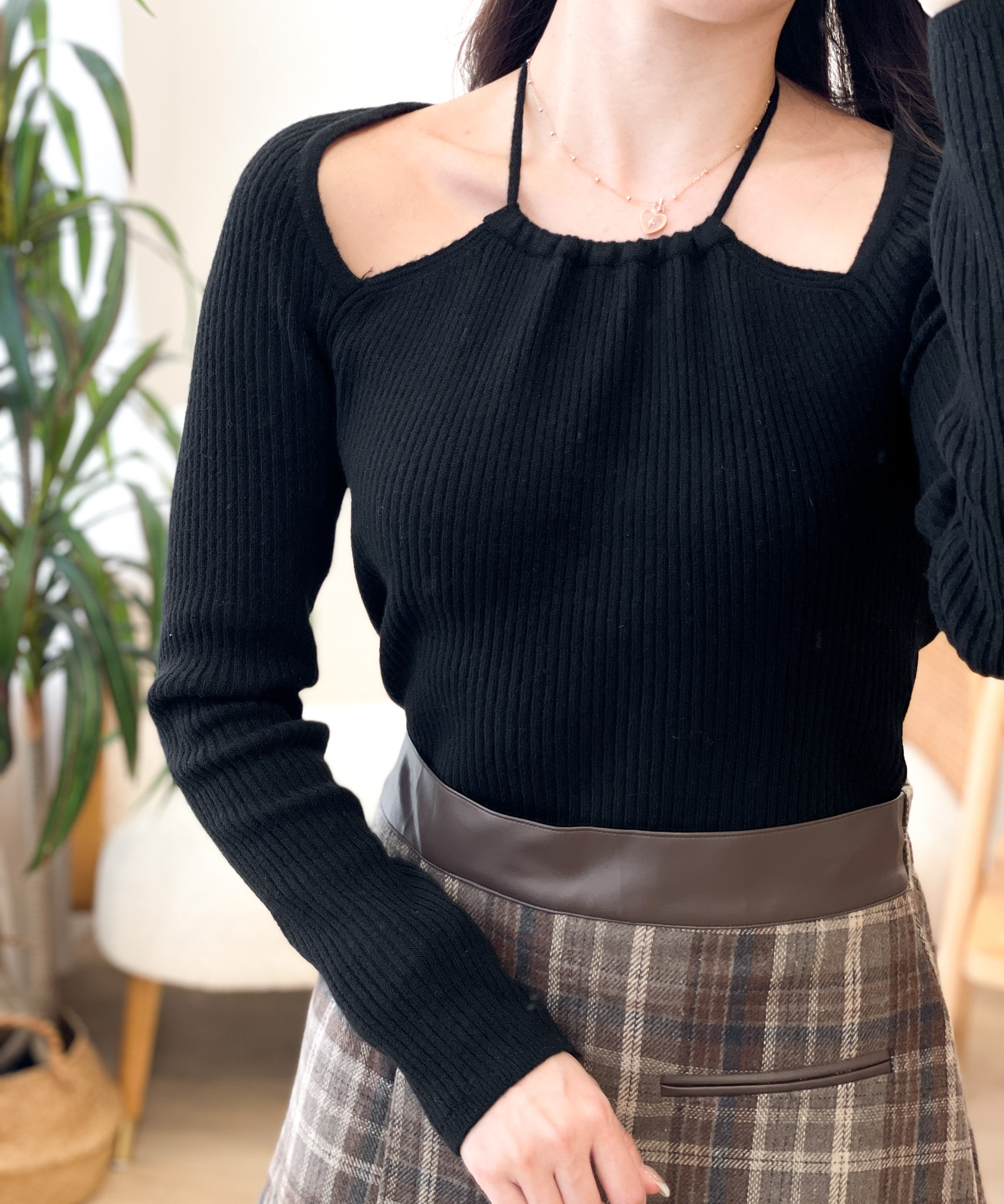T1437 Ribbed Halter Long-sleeves Top